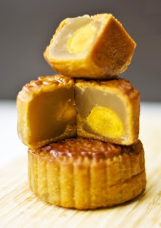 Those who have tasted a moon cake may describe it as an acquired taste; however, I think they are extraordinary. Since the filling is a paste and the crust is only thin, moon cakes are quite dense and very rich in flavour. The saltiness from the egg yolk contrasts with the sweet lotus paste, which gives an enjoyable balance of flavours. Typically, the moon cake is cut into segments and shared around, since a few pieces can be rather filling.